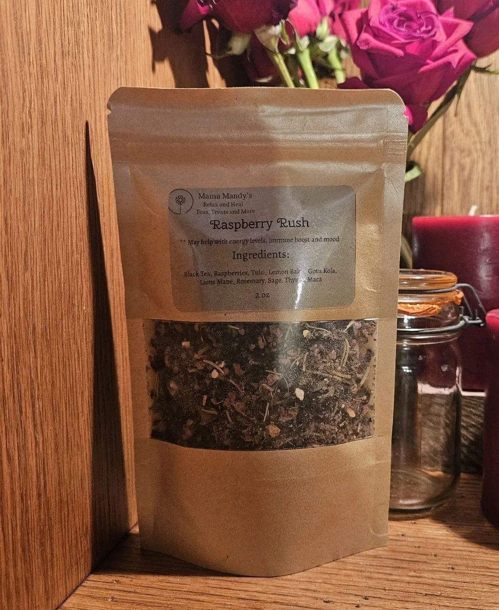 Black Tea, Raspberries, Tulsi, Lemon Balm, Gotu Kola, Lions Mane, Rosemary, Sage, Thyme, Maca